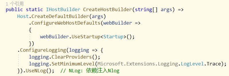 }).UseNLog(); // NLog: 依赖注入Nlog