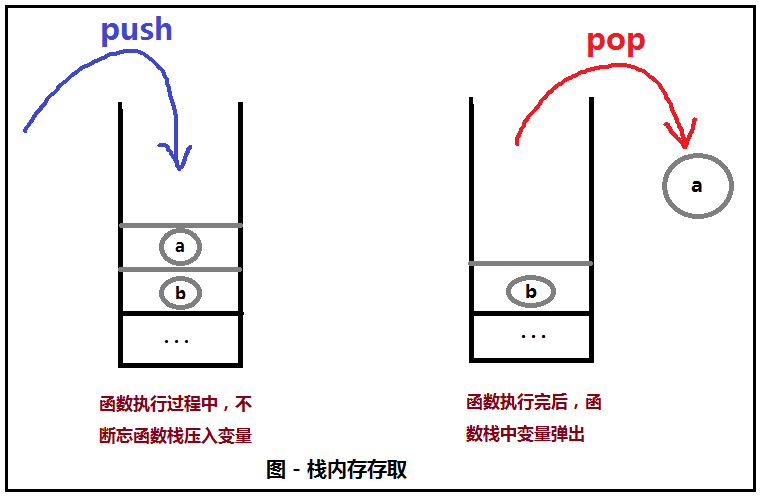 典型的栈内存使用的例子就是函数栈,每一个函数被调用时都会被分配一块内存,这块内存被称为栈内存,以先进后出的方式存取数据,在函数执行过程中不断往函数栈中压入(PUSH)数据(值类型数据:int、float、对象的引用...),函数执行完后又将函数栈中的数据逐个弹出(POP),由于是以操作栈的形式来存取,所以访问速度快。