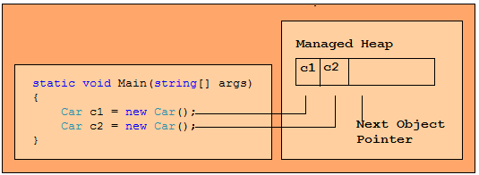 在.NET的世界,使用new关键字创建一个对象,首先对象资源被分配在托管堆中,然后new会返回一个指向堆上对象的引用,而不是真正的对象本身。如果在方法作用域中将引用变量声明为本地变量,这个引用变量保存在栈内,以供应用程序以后使用。