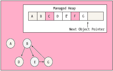 假设托管堆上有名字为A,B,C,D,E,F和G的对象集合。在一次垃圾回收过程中,会检查这些对象(同时包括这些对象可能包含的内部对象引用)是否是根可达的。一旦图被建立起来,不可达的对象(在此是对象C和F)被标记为垃圾。