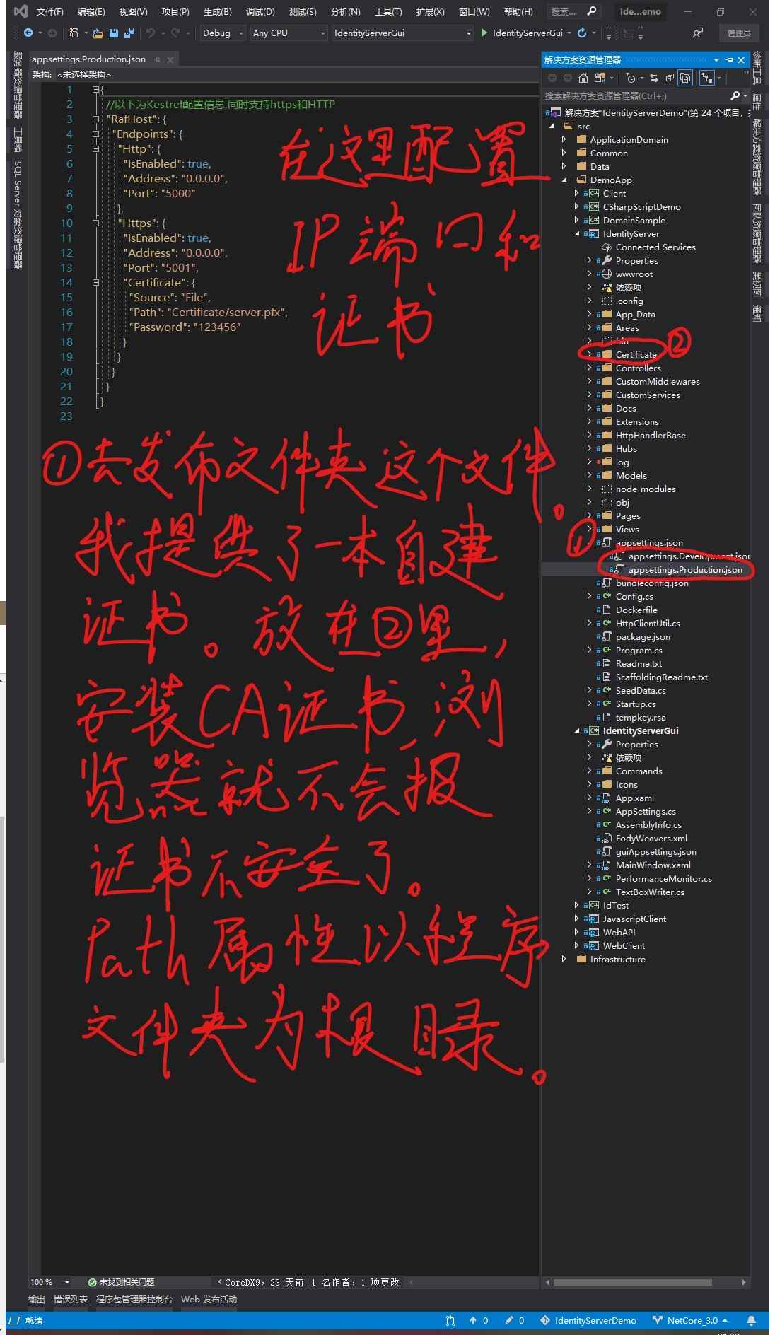 还原解决方案的 Nuget 包,还原 IdentityServer 的 npm 包。在 IdentityServer 和 IdentityServerGui 上右键,选择发布, 其中 IdentityServer 使用FolderProfileRelease 配置进行发布。如果没有问题的话稍等片刻发布成功,到解决方案根目录找到.publish 文件夹,进去把 IdentityServerGuirelease 文件夹中的所有东西复制粘贴到IdentityServerrelease 文件夹中,途中如果存在重名文件,请忽略大小时间都相同的文件,其他文件尽量选最新或最大的,除非你清楚哪个是你要的。推荐在 Win 10 下操作,或者用其他更智能的文件拷贝软件。