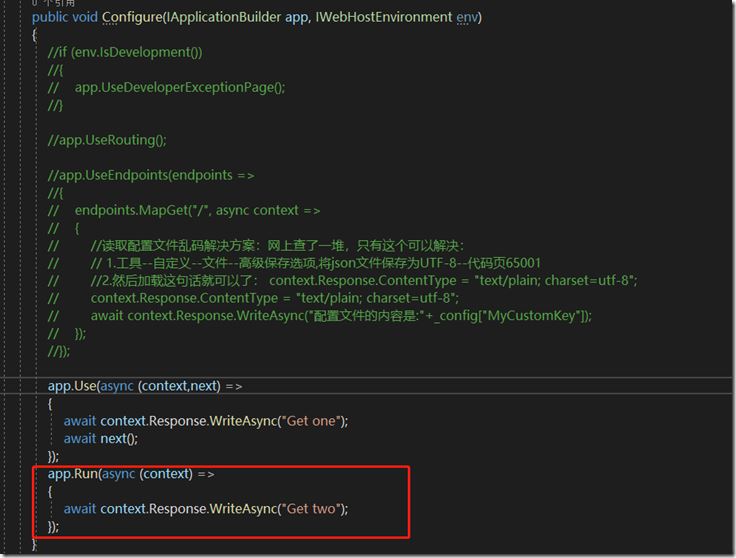 你可以看到,并没有得到我们想要的输出结果,页面上显示的是我们在Configure方法中,使用Run扩展方法,输出的结果:也就是Get One GetTwo