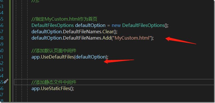 注意:你需要将UseDefaultFiles中间件,写在UseStaticFiles中间件的上面。需要记住的是:UseDefaultFiles中间件仅仅只是将URL重写,并不处理静态文件。它的工作就是把URL重写为默认文件,然后UseStsticFiles中间件,就去处理这个默认文件,我们就看到页面了。