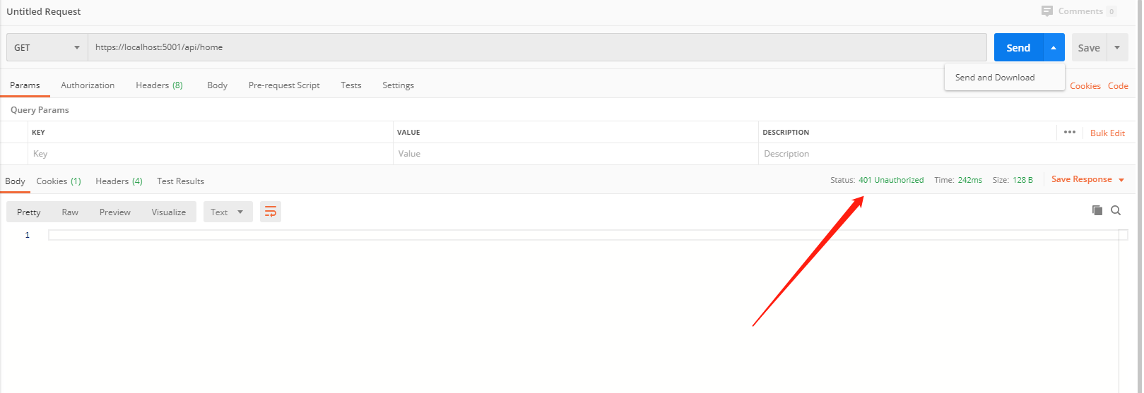 发现报 401 (无权限)状态码,这是因为请求时不携带令牌,会导致不能访问 API。