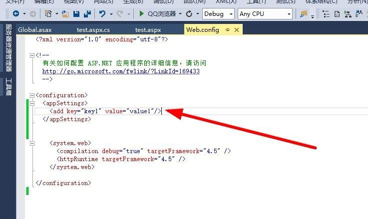 第三,在“<appSettings>”中添加你想要的全局变量“<add key="key1" value="value1"/> ”详细代码见下图。