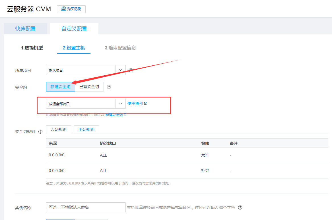 下一步设置主机,选择【新建安全组】,然后下拉框选【放通全部端口】(因为我们是学习临时使用,不用在意什么安全性的问题了)