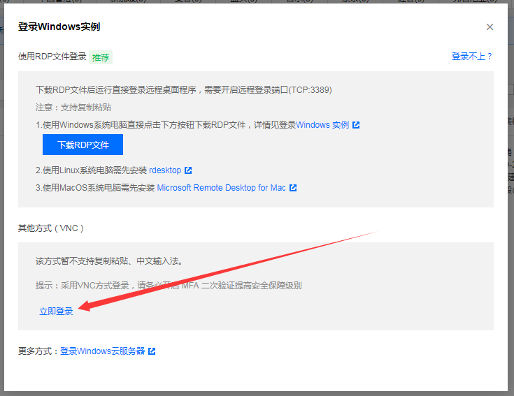 确定之后,弹出登录Windows实例窗口,用其他方式(VNC)点击【立即登录】。