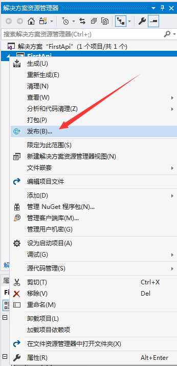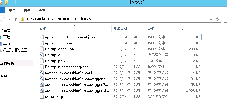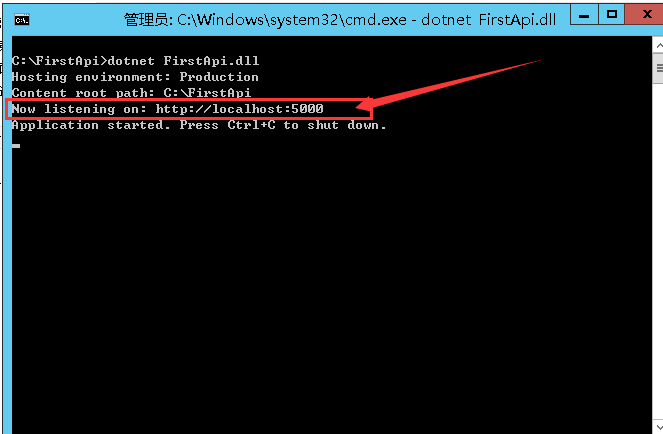 会发现我们cmd的路径直接在该文件夹里,然后执行下面的命令(FirstApi是你的项目名,也就是上图中FirstApi.dll文件)。