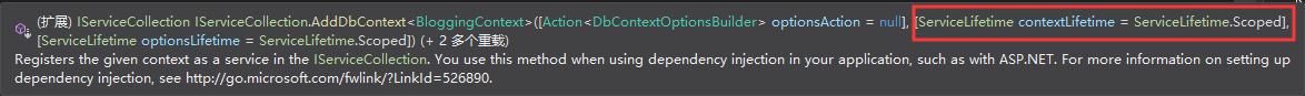 所以前面那种关闭验证的方式是错误的。这是因为,root provider只有一个,如果恰好有某个singleton服务引用了一个scope服务,这会导致这个scope服务也变成singleton,仔细看一下注册DbContext的扩展方法,它实际上提供的是scope服务: