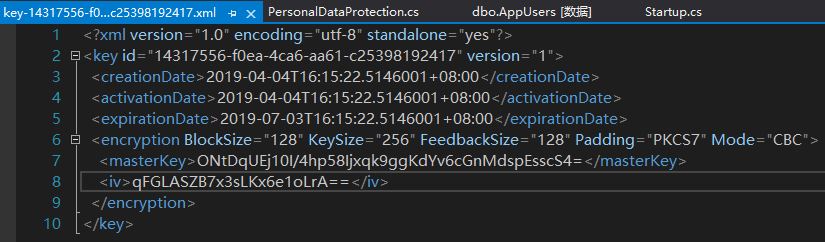 在其中我还使用了我在其他地方写的底层基础工具类,如果想看完整实现可以去我的 Github 克隆代码实际运行并体验。在这里大致说一下这两个类的设计思路。既然微软设计了钥匙串功能,那自然是要利用好。我在代码里写死每个钥匙有效期90天,过期后会自动生成并使用新的钥匙,钥匙的详细信息使用xml文档保存在项目文件夹中,具体见下面的截图。Identity 会使用最新钥匙进行加密并把钥匙编号一并存入数据库,在读取时会根据编号找到对应的加密器解密数据。这个过程由 EF Core 的值转换器(EF Core 2.1 增加)完成,也就是说 Identity 向 DbContext 中需要加密的字段注册了值转换器。所以我也不清楚早期 Identity 有没有这个功能,不使用 EF Core 的情况下这个功能是否可用。