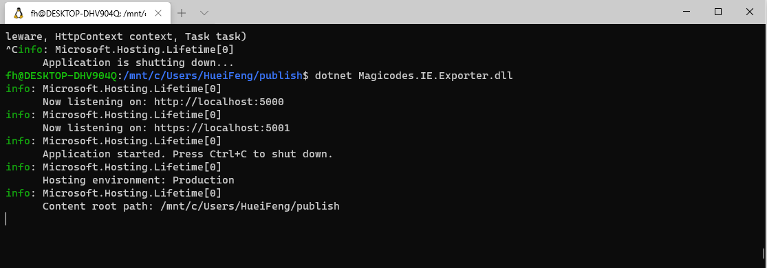 通过上面一波操作后我们需要做的是在WSL提示符下,输入dotnet并加上我们的应用程序集名称