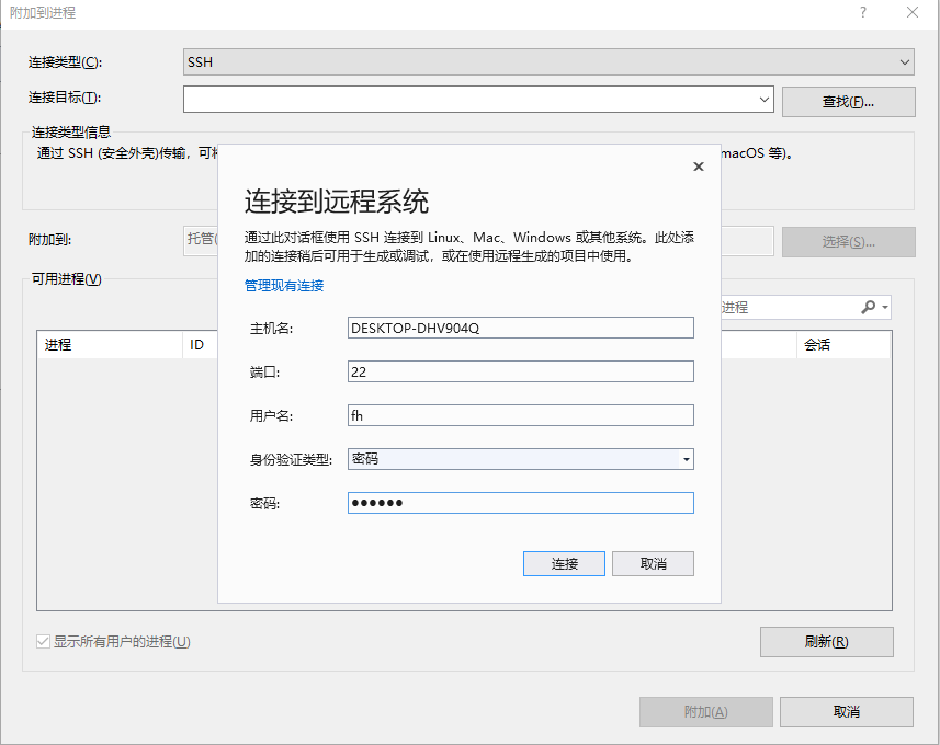 现在我们可以选择SSH作为连接类型,同时需要点击“刷新”按钮将这些信息填充,如下所示: