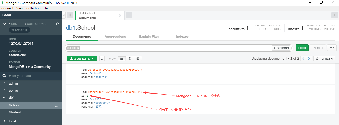 当然School对象之后多加或者去掉一个字段都行。Mongodb是用Json保存的,因此也可以直接用Json格式插入,可用BsonDocument对象作为泛型对象。