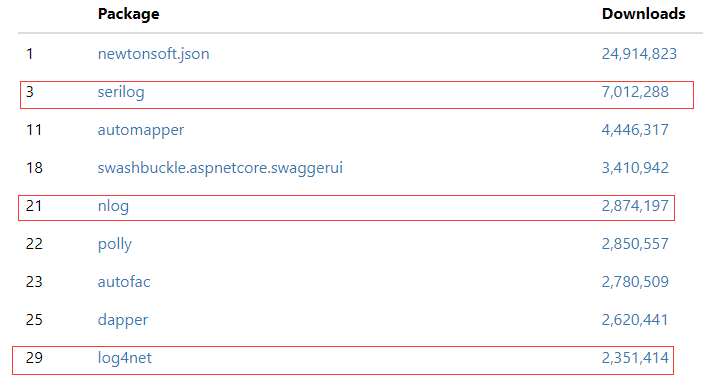 log4net,NLog和Serilog这3种日志记录框架几乎在.NET空间中占主导地位,不需要太多介绍。看看最近6周的下载排名就知道了。如图