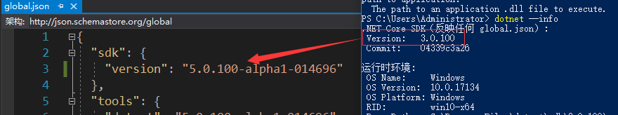 解决办法:查看本地安装的sdk 与 global.json中制定的版本是否一致:然后修改即可