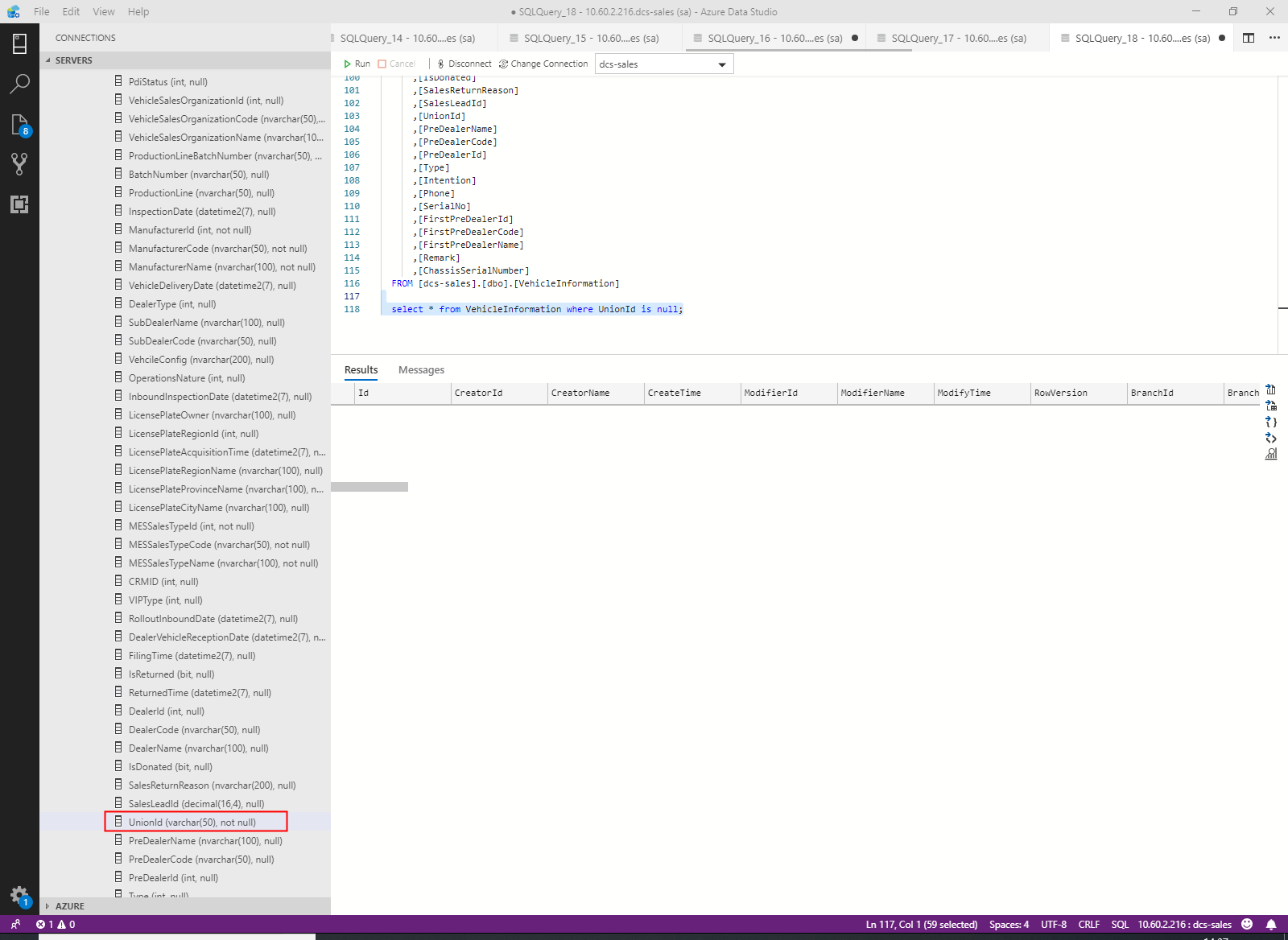 既然报错信息中是SqlTypes.SqlString'和SqlTypes.SqlGuid之间的转换有问题那么我们断定有一个字段数据库中定义的类型和实体中定义的类型不匹配,而且其中有一种是guid类型,由于我们的实体中guid类型的字段要少于string类型的字段,所以我们首先从guid类型下手,我们看看VehicleInformation中是否有哪种guid类型和数据库不匹配。然后还真的发现了这个类型 public Guid UnionId { get; set; },在我们的实体中定义了一个guid类型的字段UnionId这个是在迁移过程迁移到数据库的,然后我们来查看数据库中的类型。