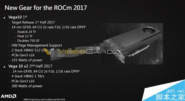 2017年下半年将看到双芯的Vega 10,HBM2显存也翻番到4颗总计32GB,带宽达1TB/s,而整卡功耗为300W。
