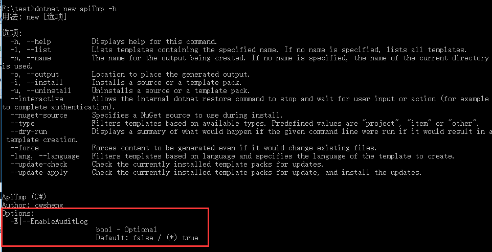 //不使用数据库 dotnet new apiTmp -n AA -D None //使用PG数据库 dotnet new apiTmp -n BB -D PgSQL
