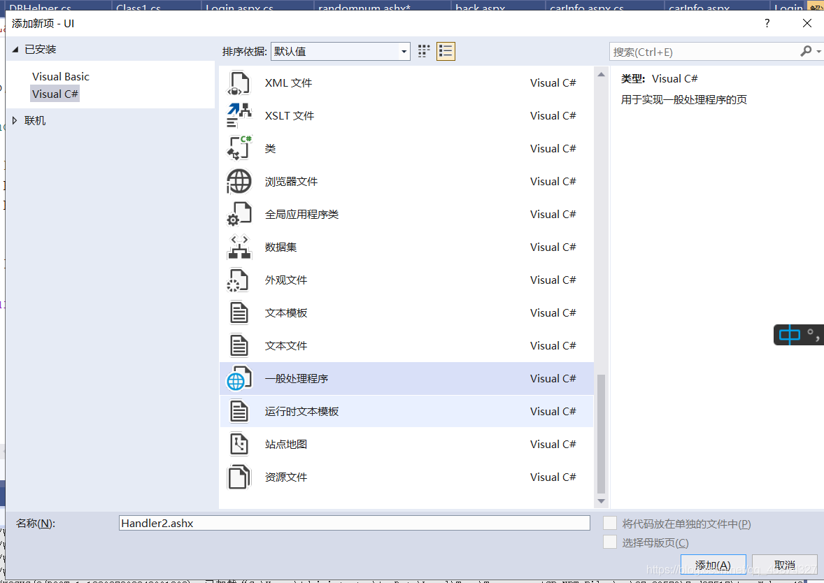 创建好了就是这样的,如果没有一般处理请看下面:右击添加新项,然后找到一般处理程序