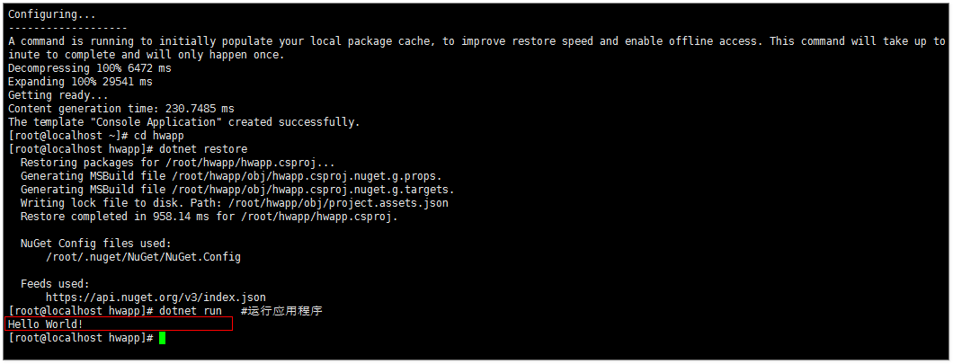 dotnet new console -o hwapp # 我们初始化一个示例Hello World应用程序 (这里稍微耗时点) cd hwapp