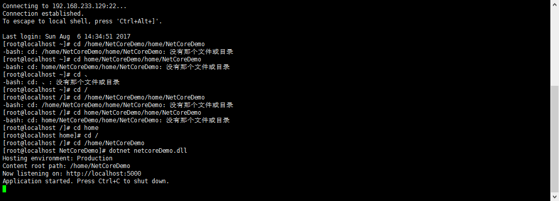cd /home/NetCoreDemo #这个目录 要输入你自己对应放的目录 dotnet netcoreDemo.dll # netcoreDemo.dll 这个对应你建的项目生成的dll