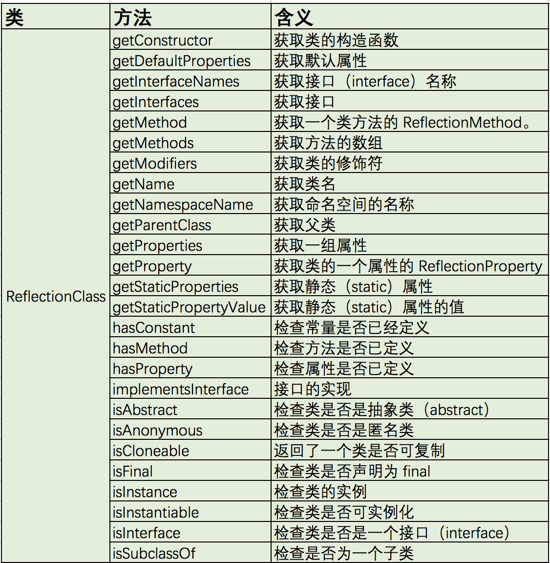 4、除了ReflectionClass和ReflectionMethod,我们对于类中的参数、属性和php服务的环境变量、扩展等参数也是可以通过反射API的一些方法来执行的,如下: