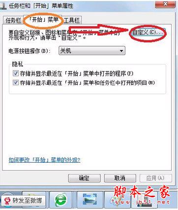 打开“属性”——“开始菜单”标签——“自定义”,如下图: