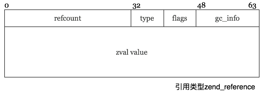 所以对于IS_LONG的引用来说, 就用一个类型是IS_REFERNCE的zval, 它指向一个zend_reference, 而这个zend_reference->val中是一个类型为IS_LONG的zval.