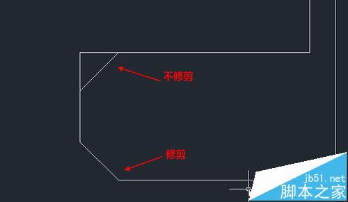 2、修剪(T):默认为修剪模式,就是将原来的直线超出倒角的部分修剪掉,如果设置为不修剪,则生成倒角的同时原有的线保留不变,如下图所示。