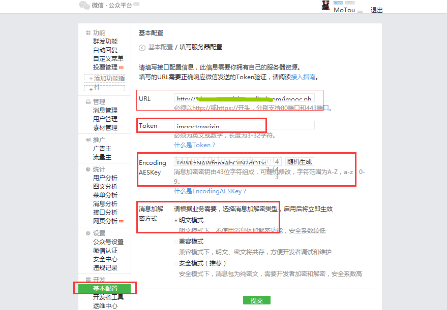 需要注意的是,“接口配置信息”中,URL为验证 token 的回调地址,此URL填写时多半需要你已经将代码上传的外网可访问的地址,我在后面会提供相应代码,再者注意Token值的确定,因为后面代码中会用到