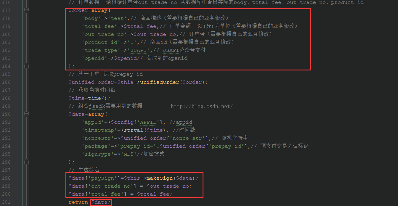 $total_fee = floatval($order_amount)*100; $order=array( 'body'=>'testMsg',// 商品描述(需要根据自己的业务修改) 'total_fee'=>$total_fee,// 订单金额 以(分)为单位(需要根据自己的业务修改) 'out_trade_no'=>$out_trade_no.'M'.time(),// 订单号(需要根据自己的业务修改) 'product_id'=>'1',// 商品id(需要根据自己的业务修改) 'trade_type'=>'JSAPI',// JSAPI公众号支付 'openid'=>$openid// 获取到的openid );