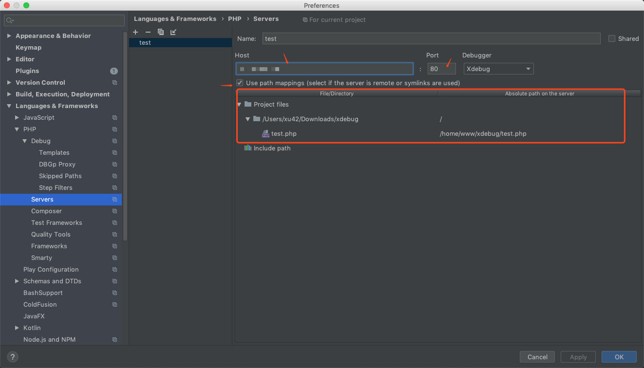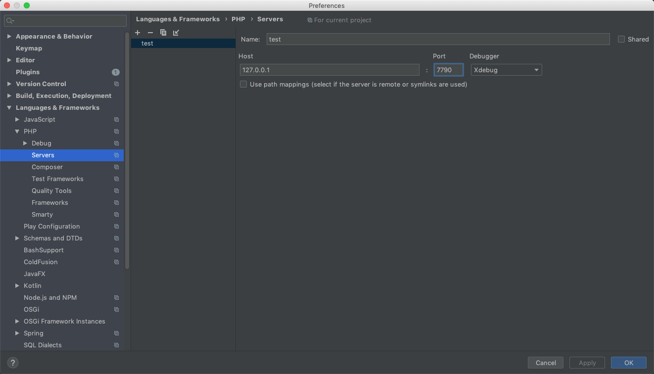 我是在~/Downloads/xdebug/ 目录下放了一个简单的PHP文件test.php来测试,在这个目录下用php -S 127.0.0.1:7790起了个http服务,可参考进行下述配置。