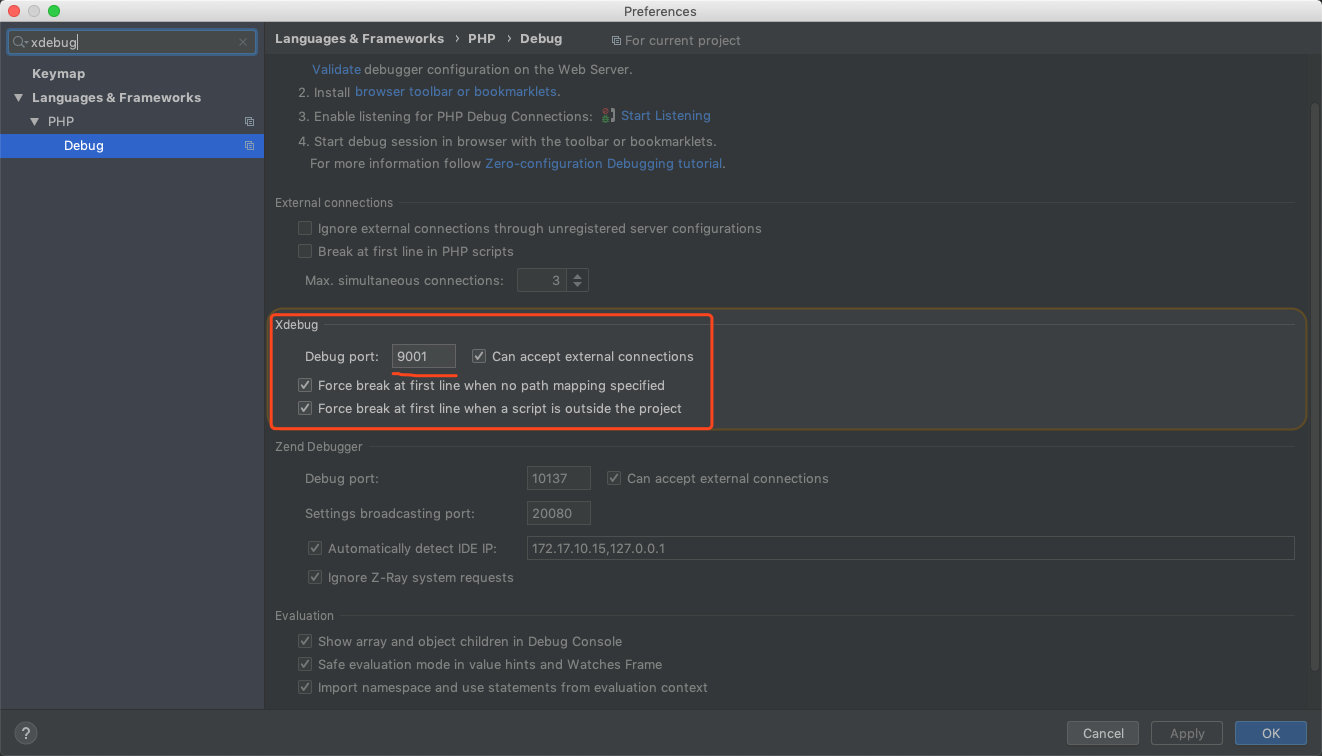 [xdebug] zend_extension="xdebug.so" xdebug.remote_enable=On xdebug.remote_port=9001 xdebug.idekey=PHPSTORM xdebug.remote_connect_back = 1