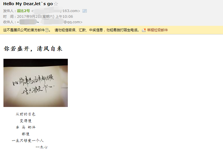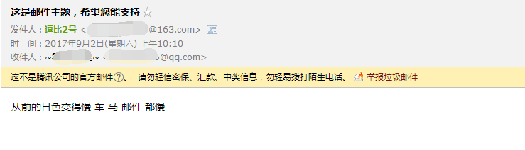- 此方法为发送纯文本邮件的功能实现,调用此方法发送的邮件截图如下: