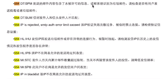 - 有时邮件发送时,会有如下报错,例如 554 多表示邮件发送过多被系统禁止了,具体信息可通过提示信息中的网址进行查询.