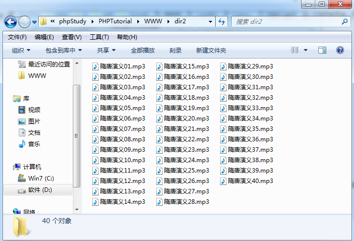文件夹内容如下,现在使用php读取这个文件夹里面的文件,并批量重命名为"隋唐演义+序号.mp3"的格式: