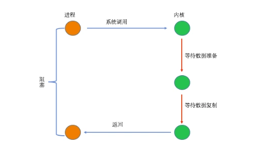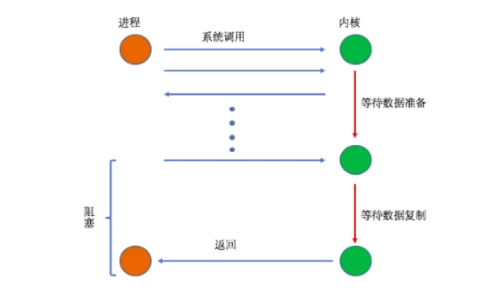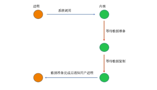 当用户进程进行系统调用时,内核就开始了I/O的第一个阶段,准备数据到缓冲区中,当数据都准备完成后,则将数据从内核缓冲区中拷贝到用户进程的内存中,这时用户进程才解除block的状态重新运行。