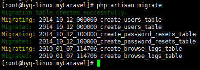 代码如上,编辑完成后,执行命令 php artisan migrate 会将所有未执行迁移的数据表创建。如下