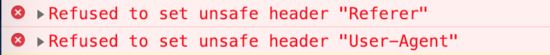 Referer 属性出现在请求头中,也在请求头中被设置,但是在浏览器的安全策略里,该值无法被 js 所指定: