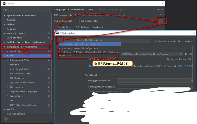 设置本地的php解释器,即php的二进制文件,windows下的php安装路径下的php.exe,类unix系统就是bin/php文件