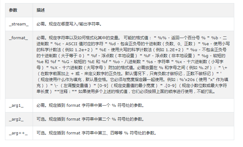 arg1、arg2、++ 参数将被插入到主字符串中的百分号(%)符号处。该函数是逐步执行的。在第一个 % 符号处,插入 arg1,在第二个 % 符号处,插入 arg2,依此类推。