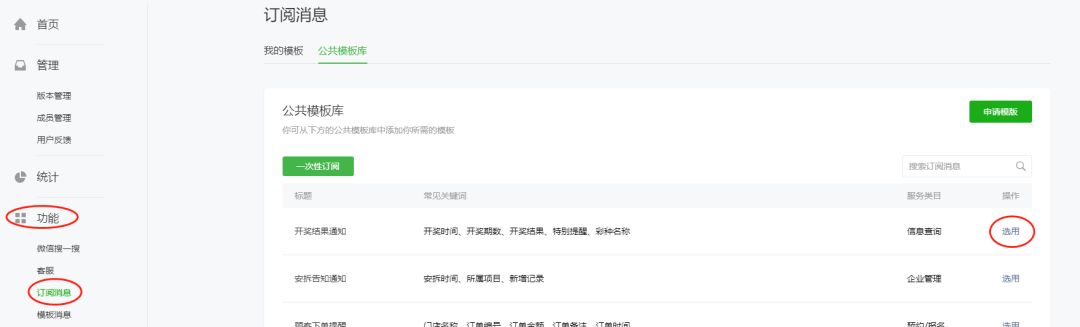 这个在小程序后台的公共模板库找到适用的模板选用,之后到我的模板中复制系统分配的模板 ID即可。如果没找到合适的,就需要自己申请模板,3 - 7 天审核期。