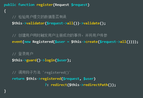 如果我们使用了 Laravel 自带的 RegisterController ,控制器通过加载 IlluminateFoundationAuthRegistersUsers trait 来引入框架的注册功能,此时我们打开此 trait 来翻阅源码并定位到 register(Request $request) 方法: