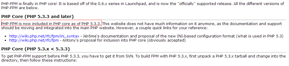实在没别的办法,于是打算重装php-fpm试试,遂去http://php-fpm.org/download/想下载个新版本的php-fpm,结果发现版本大于5.3.3的PHP内部已经集成了php-fpm,不用再另行安装了。