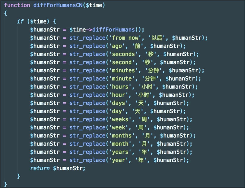 在我们过去的Laravel项目中,经常需要用到time_ago这样的字段,并将其转换为我们熟悉的本地语言,可以实现的方式有很多,比如编写一个time_ago的辅助函数将其转换成本地,或采用carbon的diffForHumans函数然后替换成本地语言来实现.
