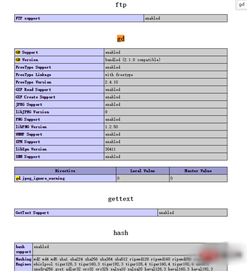 在浏览器中访问到第一步中新建的phpinfo.php文件。Ctrl+F查询gd,如果有出现,就表示gd2库已经加载了,如果验证码还是不显示,请继续看下一步。