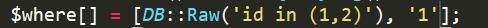 $where = function ($query) {$query->whereIn('id', [1,2])->orWhere('d_id', '=', '83');}