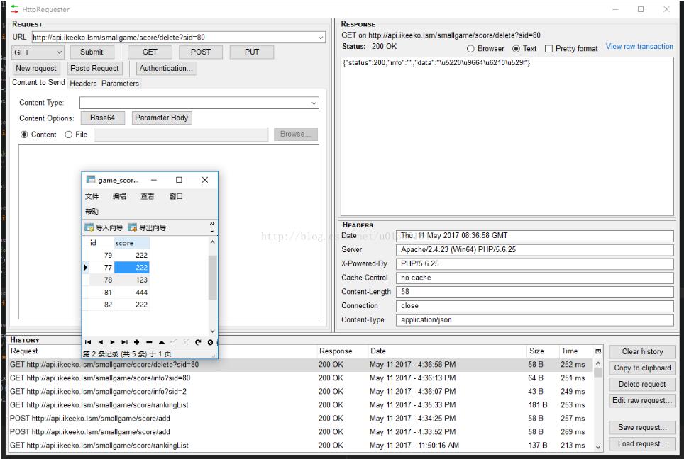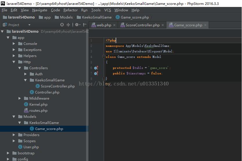 2.路由配置,'namespace' => 'KeekoSmallGame'此命名空间对应的路径为AppHttpControllersKeekoSmallGame,Route::post('score/add','ScoreController@addScore'); post为请求方式,score/add为访问路径,ScoreController为指定控制器名,addScore为该控制里的方法。