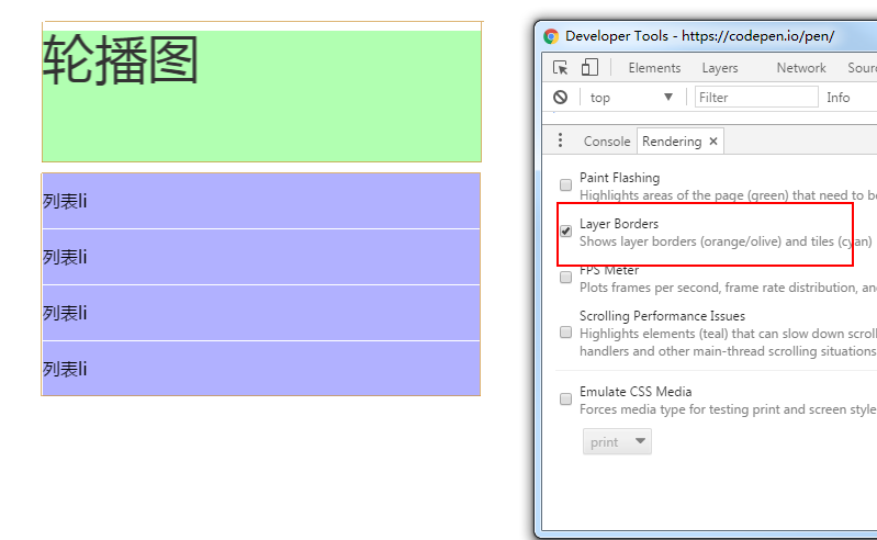 但是!在上面的图中,我们并没有给下面的list也添加任何能触发生成 Graphics Layer 的属性,但是它也同样也有黄色的边框,生成了一个独立的复合层。
