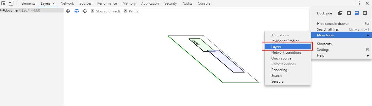 上面观察页面层级的 chrome 工具非常吃内存?好像还是一个处于实验室的功能,分析稍微大一点的页面容易直接卡死,所以要多学会使用第一种观察黄色边框的方式查看页面生成的 Graphics Layer 这种方式。
